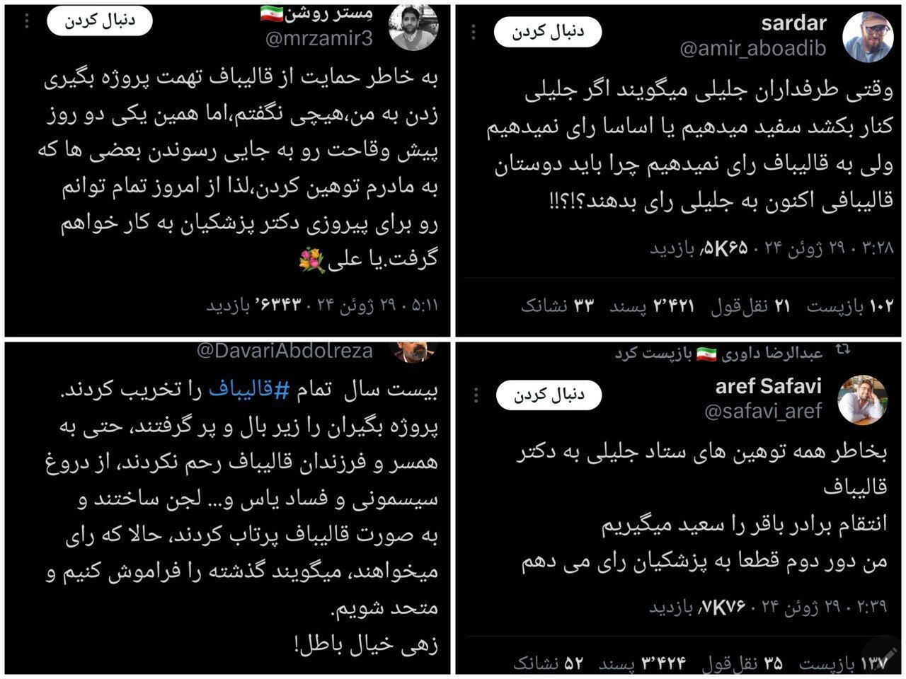 همچنین به نظر میرسد فعالان توئیتری قالیباف در حال اعلام برائت از جلیلی و پیوستن به کمپین حامیان دکتر پزشکیان هستند. گفتنی است در روزهای اخیر درگیریهایی میان طرفداران جلیلی و قالیباف شکل گرفته بود و هریک از طرفین سعی در متقاعد کردن دیگری برای انصراف داشتند.