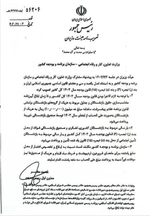 ۱- با توجه به لازم الاجرا بودن قانون بودجه سال ۱۴۰۳ کل کشور و تا زمان ابلاغ آیین نامه متناسب سازی حقوق بازنشستگان و جداول مربوط به هر یک از گروههای بازنشستگان براساس قانون برنامه هفتم پیشرفت ماهانه مبلغ ده میلیون ۱۰,۰۰۰,۰۰۰ ریال به هر یک از بازنشستگان به صورت علی الحساب از ابتدای سال ۱۴۰۳ توسط صندوق بازنشستگی ذی ربط پرداخت میشود.