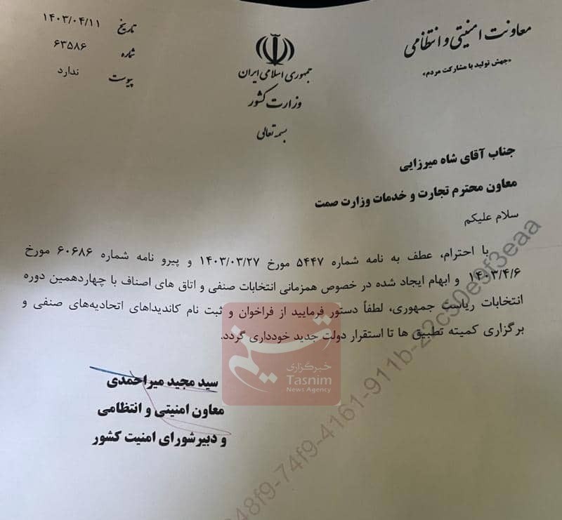 بنابراین گزارش معاون وزیر کشور در پاسخ به درخواست و پیگیری های صفایی رییس اتاق اصناف ایران دستور داد تا زمان استقرار دولت چهاردهم فرایند برگزاری و فراخوان انتخابات اتحادیه های صنفی واتاق اصناف در کشور متوقف شود.