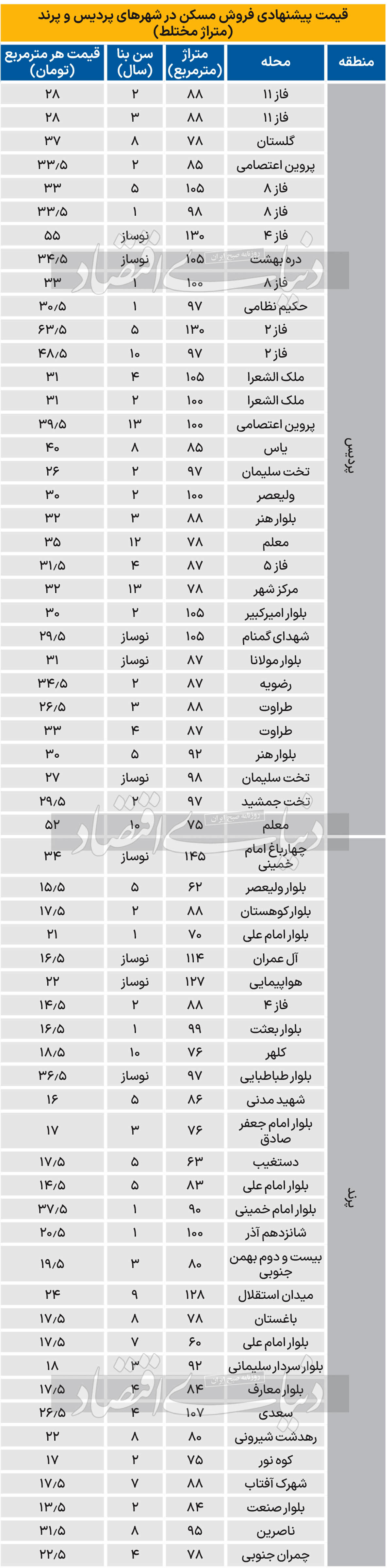 نتایج تحقیقات میدانی از بازار فروش واحدهای مسکونی مهر و غیرمهر در این دو شهر جدید حاکی است، متوسط «قیمت پیشنهادی» در پردیس در حال حاضر مترمربعی ۳۴ میلیون تومان و در پرند مترمربعی ۲۰ میلیون تومان است.