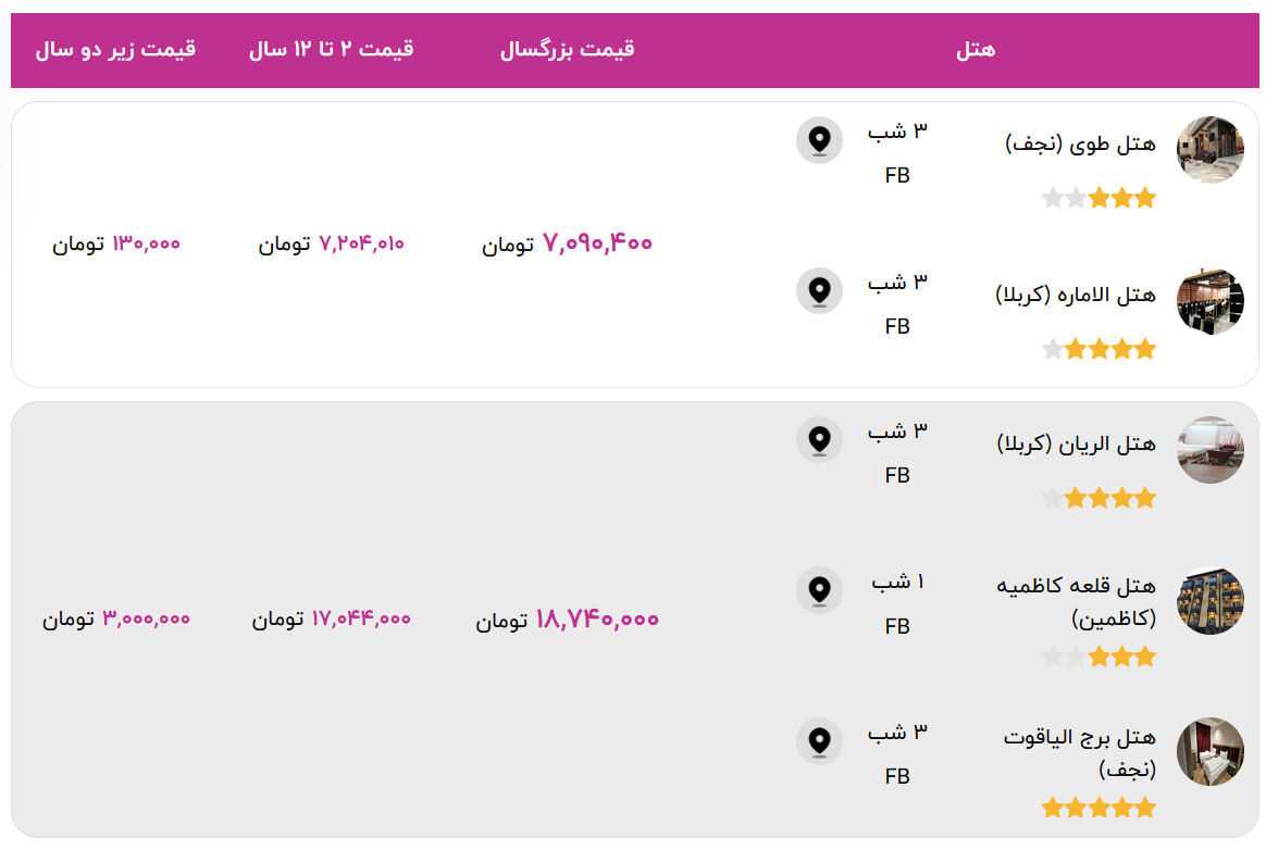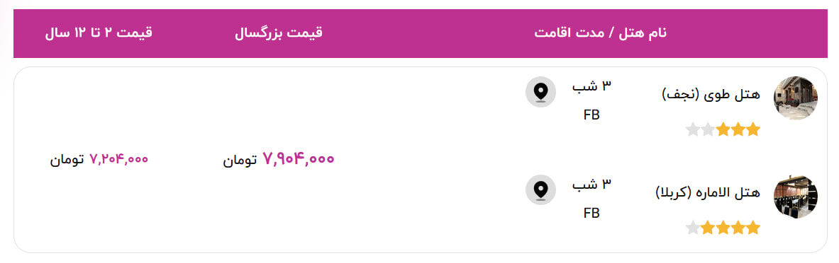قیمت تور اول شامل سه شب اقامت رد هتل الاماره‌ی کربلا و سه شب اقامت در هتل طوی نجف برای هر بزرگسال حدود هفت میلیون تومان قیمت دارد. این در حالی است که هزینه کل سه شب اقامت در هتل الریان (کربلا) و یک شب اقامت در هتل قلعه کاظمیه (کاظمین) و سه شب در هتل برج الیاقوت (نجف) به ازای هر نفر ۱۸ میلیون و ۷۴۰ هزار تومان، برای کودکان بین ۲ تا ۱۲ سال نفری ۱۷ میلیون و ۴۴ هزار تومان و برای کودکان زیر ۲ سال، سه میلیون تومان هزینه دارد.