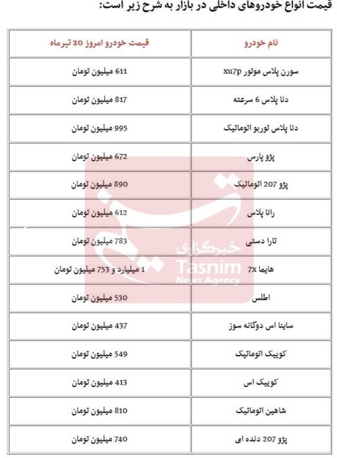 قیمت انواع خودروهای داخلی در بازار بهشرح زیر است: