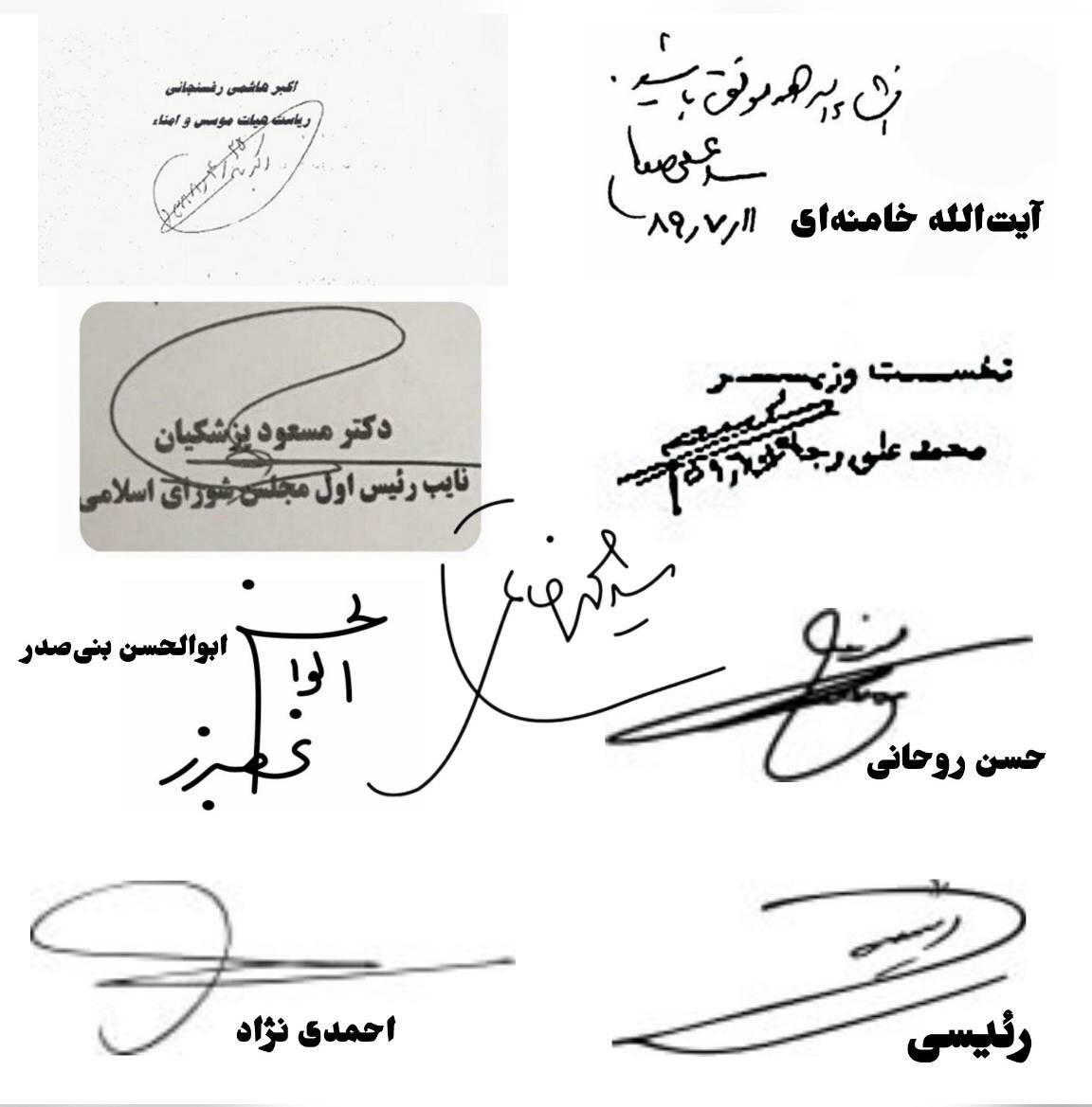 امضاهای آیت الله خامنه ای، هاشمی رفسنجانی، در ردیف زیرین، محمدعلی رجایی، مسعود پزشکیان، ردیف بعدی، حسن روحانی، محمد خاتمی، ابوالحسن بنی صدر، و در نهایت ابراهیم رئیسی و محمود احمدی نژاد را می بینید.