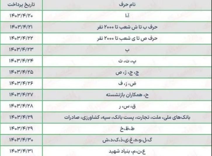 جدول تاریخ قطعی واریز حقوق تیر ۱۴۰۳ بازنشستگان تامین اجتماعی بانک رفاه براساس حروف الفبا از بیستم تیر را در این مطلب مشاهده می کنید.