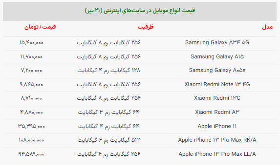 برای اطلاع از قیمت انواع گوشی موبایل شیائومی، آیفون و سامسونگ جدولی را که در ادامه آماده کردهایم بخوانید.