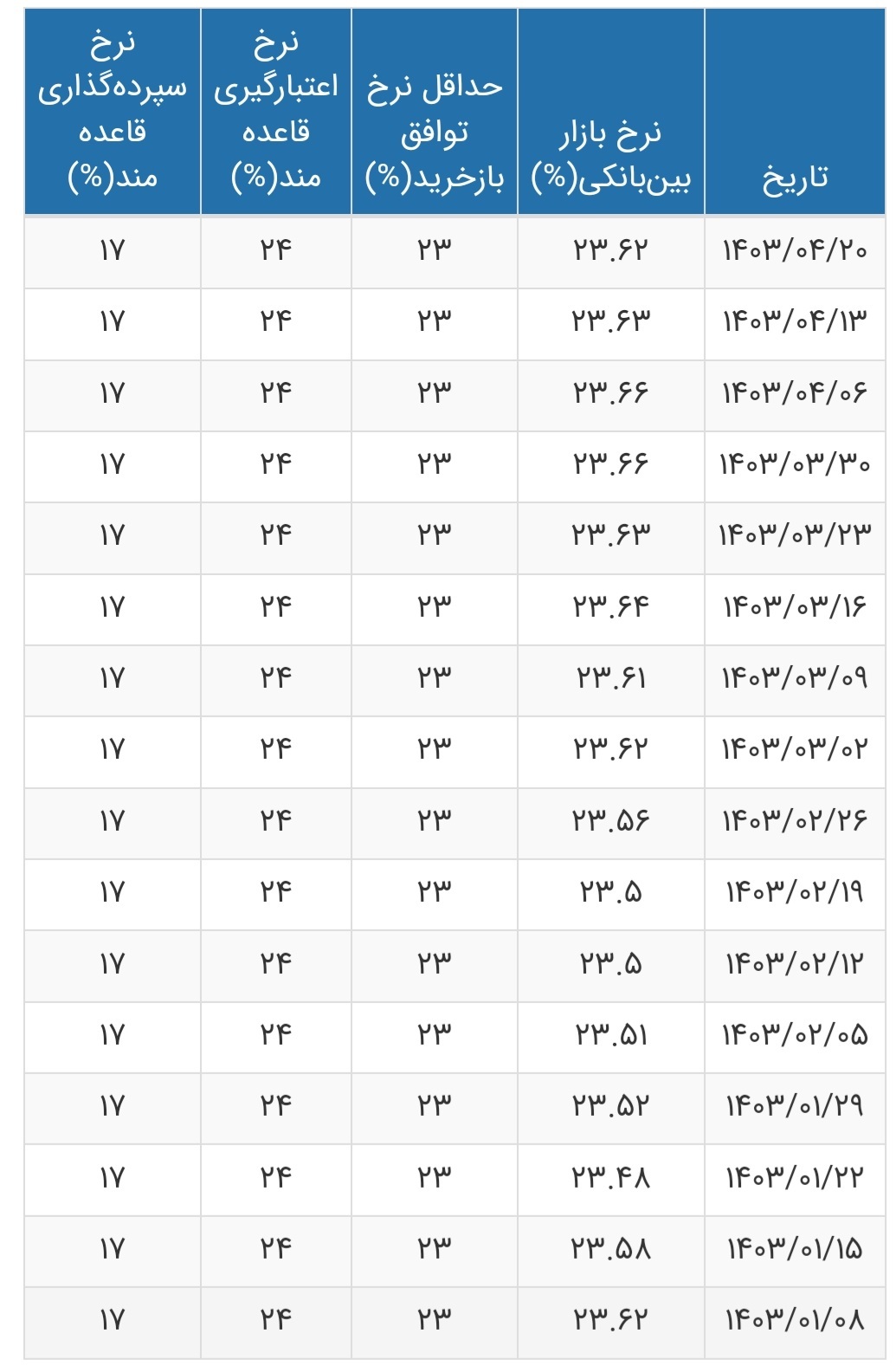 بر اساس آمار منتشر شده از سوی بانک مرکزی، نرخ بهره بین بانکی در هفته منتهی به چهارشنبه ۲۰ تیر ماه به ۲۳.۶۲ درصد رسید.