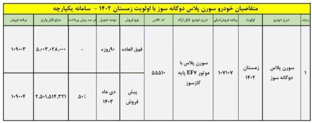 به استحضار میرساند شرایط انتخاب و واریز وجه به تعداد محدود برای متقاضیان خودرو سورن پلاس دوگانه سوز با اولویت زمستان 1402 سامانه یکپارچه مطابق جدول پیوست ایجاد شده است. لذا متقاضیان فوق میتوانند طی مدت 10 روز یا زمان تکمیل ظرفیت با مراجعه به سایت فروش اینترنتی ایران خودرو نسبت به واریز وجه اقدام نمایند.