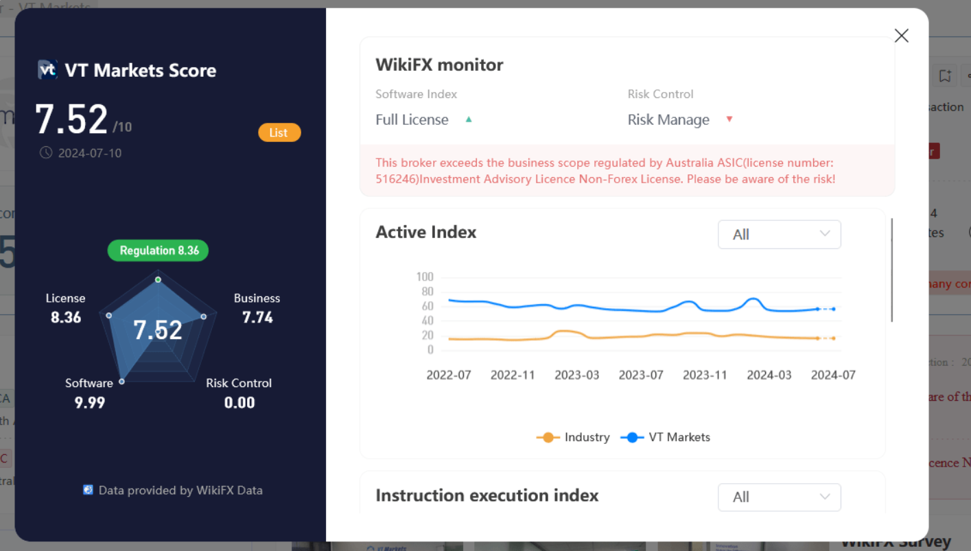 وقتی به سراغ بررسی وی تی مارکتس در وب سایت اعتبارسنجی ویکی تراست می‌رویم، مشاهده می‌کنیم که این بروکر امتیاز بالای 7.52 را بابت عملکرد خوبش دریافت کرده است. سطح رگولیشن این بروکر 8.36 می‌باشد که جزء بالاترین رتبه‌ها در بین بروکرهای فارکس است.