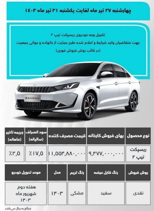 شرایط واریز وجه خودروی رسپکت در طرح مادران (جوانی جمعیت) از امروز چهارشنبه ۲۷ تیرماه به صورت اینترنتی فعال شد.