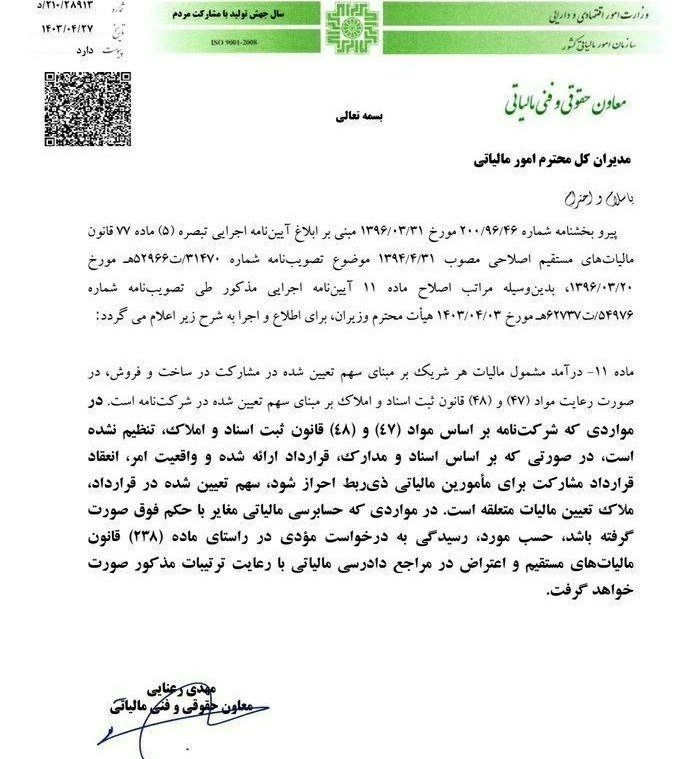 پیرو بخشنامه شماره 200٫96٫46 مورخ 1396٫03٫31 مبنی بر ابلاغ آیین نامه اجرایی تبصره (5) ماده 77 قانون مالیات های مستقیم اصلاحی مصوب 1394٫4٫31 موضوع تصویب نامه شماره 31470 ت 52966 هـ مورخ 1396٫03٫20 بدین وسیله مراتب اصلاح ماده 11 آیین نامه اجرایی مذکور طی تصویب نامه شماره 54976 ت 62737 هـ مورخ 1403٫04٫03 هیأت محترم وزیران برای اطلاع و اجرا به شرح زیر اعلام می گردد: ماده 11 درآمد مشمول مالیات هر شریک بر مبنای سهم تعیین شده در مشارکت در ساخت و فروش در صورت رعایت مواد (47) و (48) قانون ثبت اسناد و املاک بر مبنای سهم تعیین شده در شرکت نامه است. در مواردی که شرکت نامه بر اساس مواد (٤٧) و (٤٨) قانون ثبت اسناد و املاک تنظیم نشده است.
