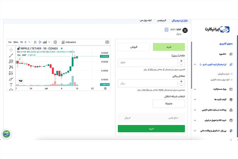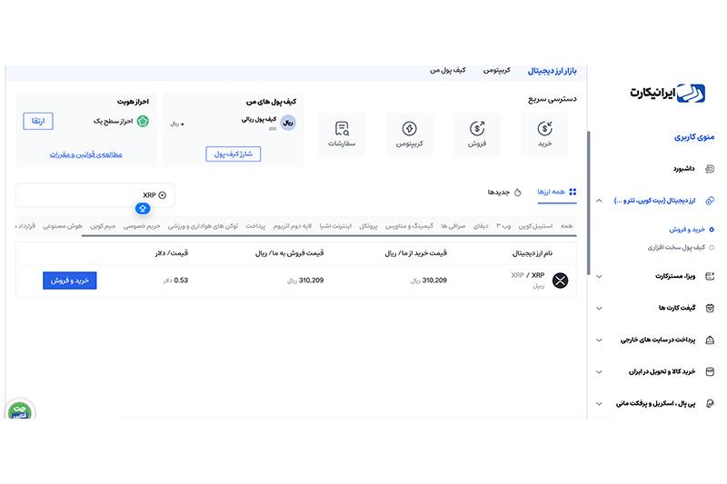 حالا که در ایرانیکارت ثبتنام کردید و حساب شما تایید شد، وقت خرید ریپل است! برای خرید ریپل از منوی داشبورد گزینه ارز دیجیتال و خرید و فروش را انتخاب کنید.