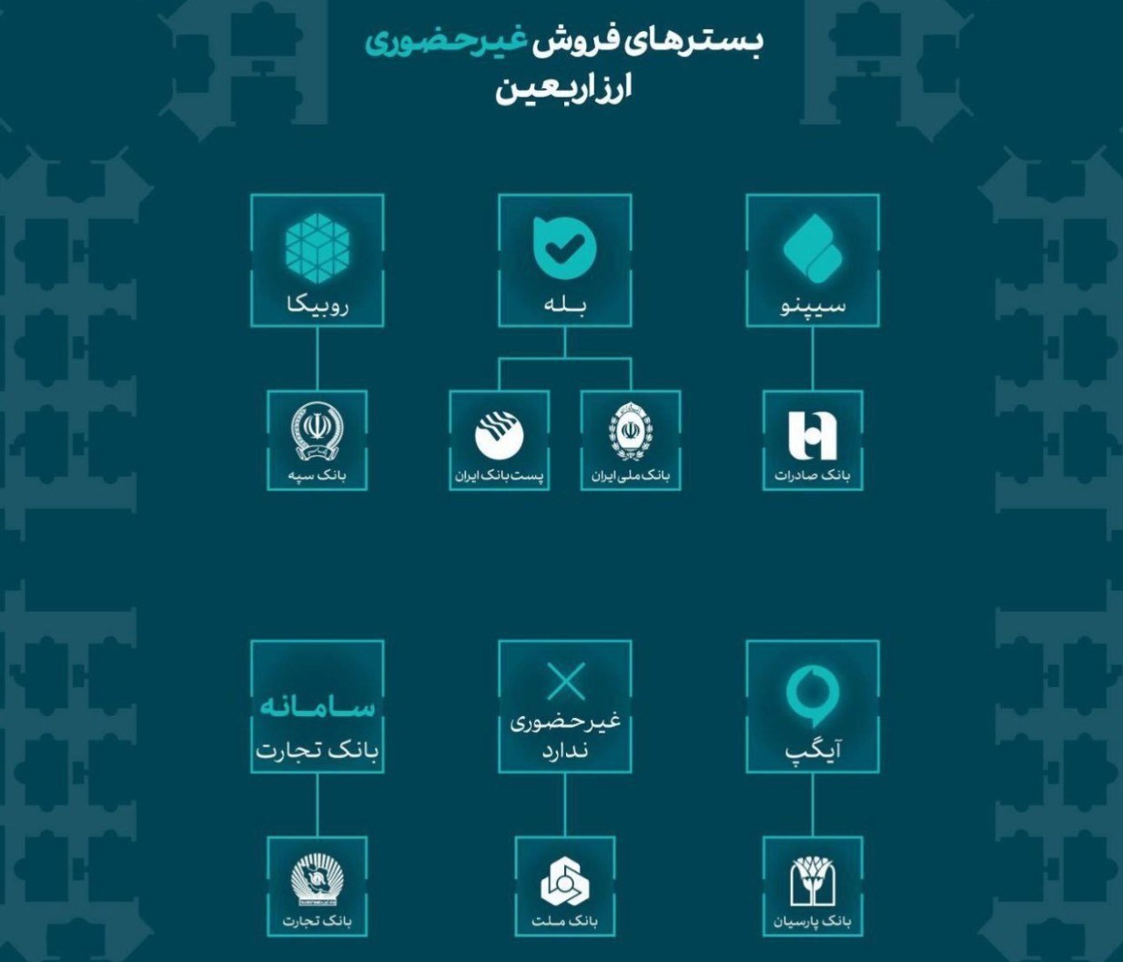 همچنین زائران میتوانند از طریق 6 سکوی فعال برای خرید ارز اقدام کنند. برهمین اساس از هفت بانک عامل عرضه کننده ارز اربعین چهار بانک با ایجاد سازوکار مناسب زمینه را برای ارائه خدمات غیر حضوری به متقاضیان دریافت ارز اربعین مهیا کردهاند، در همین راستا بانک های ملی و پست بانک در بستر پیامرسان «بله»، بانک سپه در بستر پیامرسان «روبیکا»، بانک صادرات از طریق اپلیکیشن «سیپنو» (به آدرس SEPINO.BSI.IR) خدمات غیر حضوری را به متقاضیان دریافت ارز اربعین ارائه می کنند.