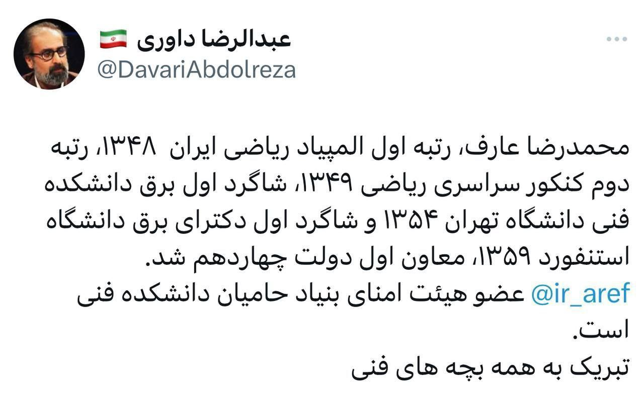 یک فعال سیاسی، درخصوص سوابق علمی محمدرضا عارف توضیحاتی را ارائه داد.