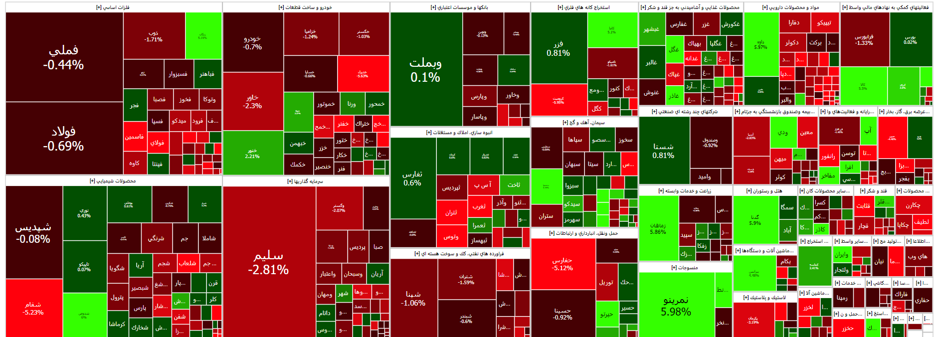 نمادهای «فملی، فارس، فولاد، شتران، خودرو، شپنا و مبین » بیشترین اثر منفی را بر شاخص بورس گذاشتند.