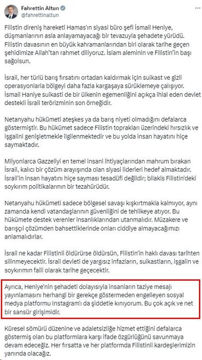 وزارت ارتباطات ترکیه در واکنش به حذف پیام های تسلیت شهادت اسماعیل هنیه رئیس دفتر سیاسی حماس از سوی شبکه اجتماعی اینستاگرام این شبکه پیام رسان را مسدود کرد.