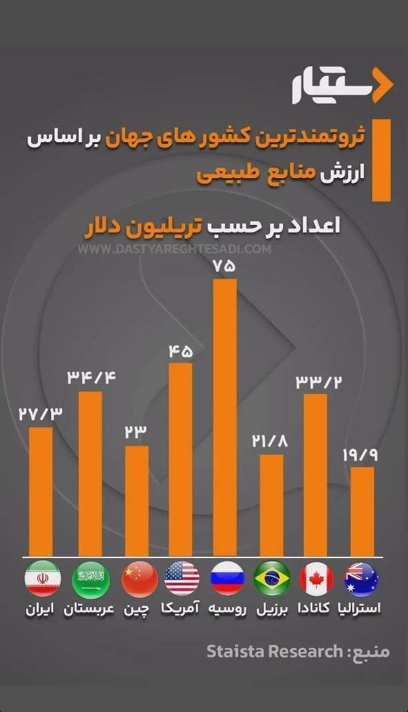 به گزارش سایت طلا، ایران با داشتن منابع طبیعی به ارزش ۲۷.۳ تریلیون دلار، در میان کشورهایی است که بزرگترین منابع طبیعی را در جهان دارند. تخمین زده می‌شود که منابع طبیعی روسیه، ۷۵ تریلیون دلار ارزش دارد و شامل نفت خام، گاز طبیعی، زغال سنگ و فلزات خاکی نادر است.