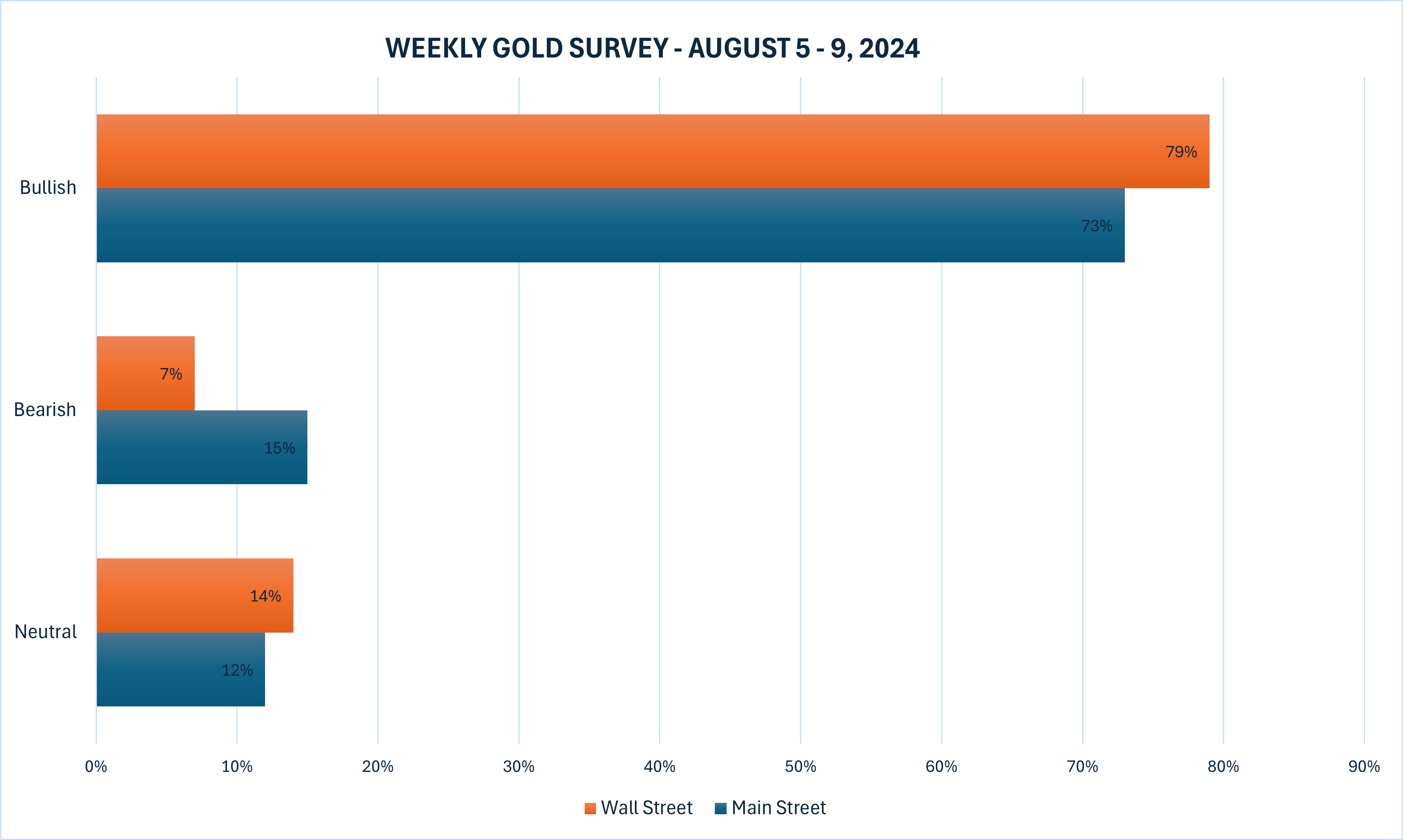 در این هفته 14 کارشناس در نظرسنجی هفتگی طلای کیتکو شرکت کردند. خوشبینی والاستریت نسبت به طلا پس از تزلزل بازارهای سهام در بحبوحه تهدیدات اقتصادی و ژئوپولیتیکی، افزایش یافته است. یازده کارشناس معادل 79 درصد کل، انتظار دارند قیمتهای طلا با رشد بیشتری در هفته معاملاتی آتی همراه شود. در این میان تنها یک کارشناس یا 7 درصد پیشبینی کرده که قیمت فلز زرد کاهش مییابد. دو کارشناس باقیمانده معادل 14 درصد، اعلام کردهاند قیمت طلا تغییری نخواهد داشت.