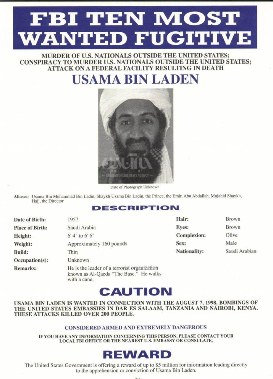 اسامه بن لادن شخصی که با رهبری گروه تروریستی القاعده امنیت ملی آمریکا و کل جهان را با خطر جدی مواجه کرد سرانجام سال 2011 در پاکستان حالی که بعد از حادثه 11 سپتامبر در سال 2001 به مدت طولانی مخفی شده بود، در طی عملیاتی ویژه توسط نیروی دریایی آمریکا کشته شد.