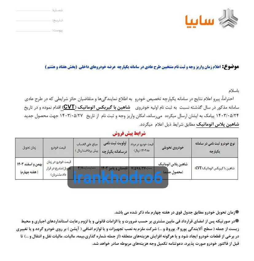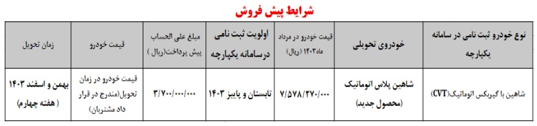 پیرو اعلام نتایج در سامانه یکپارچه تخصیص خودرو به اطلاع نمایندگی ها و متقاضیان حائز شرایطی که در طرح عادی سامانه مذکور در سال گذشته نسبت به ثبت نام اولیه خودروی شاهین با گیربکس اتوماتیک (CVT) اقدام نموده و در تاریخ 1403/05/24 پیامک به ایشان ارسال میگردد می رساند، امکان واریز وجه و ثبت نام از تاریخ 1403/05/27 جهت محصول جدید شاهین پلاس اتوماتیک مطابق شرایط ذیل اعلام میگردد.