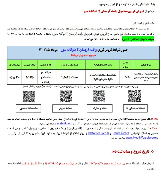 فروش وانت آریسان از سه شنبه ۳۰ مرداد ۱۴۰۳ شروع میشود.