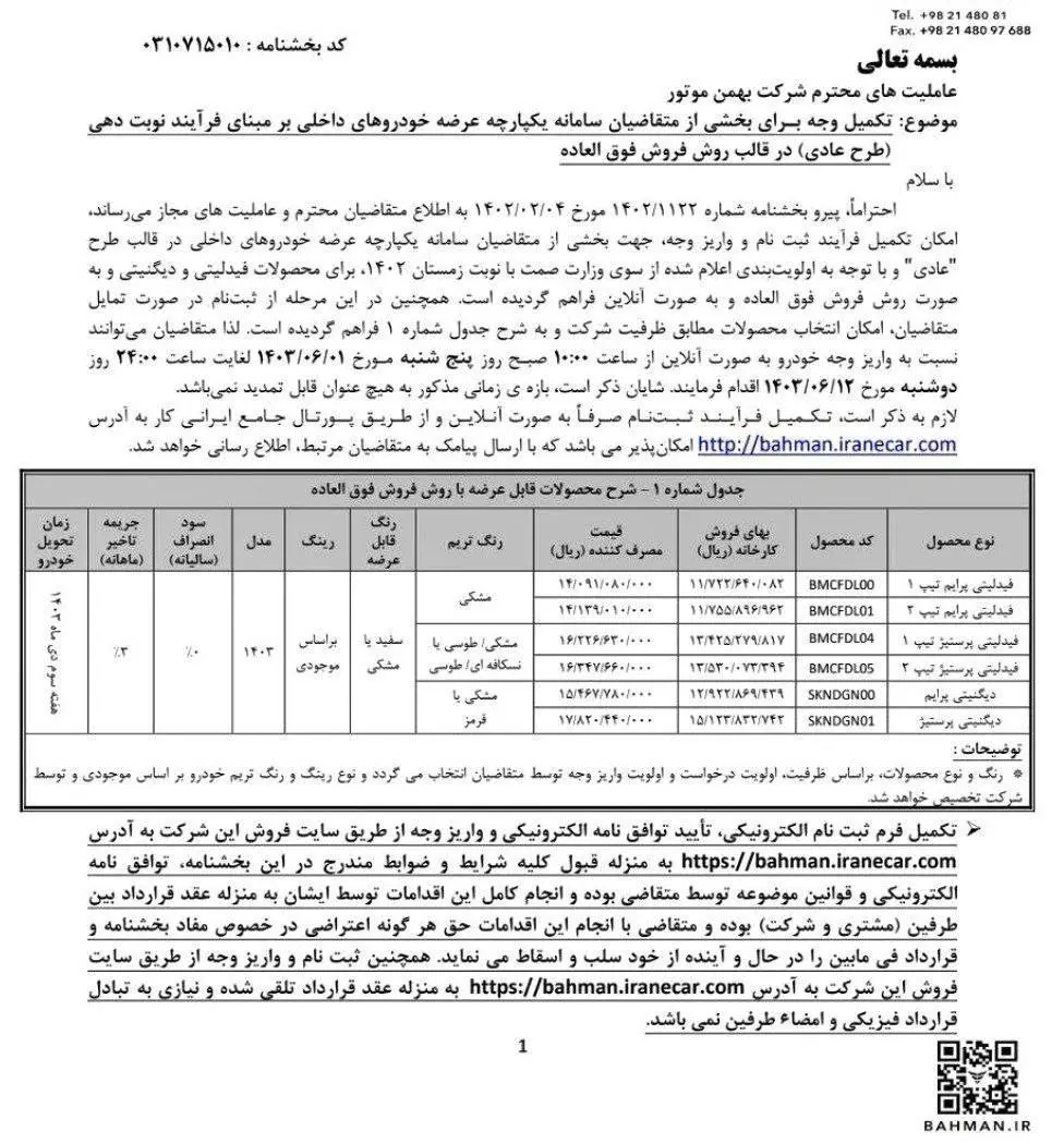 شرایط طرح فروش فوق العاده بهمن موتور در شهریور 1403 اعلام شد.
