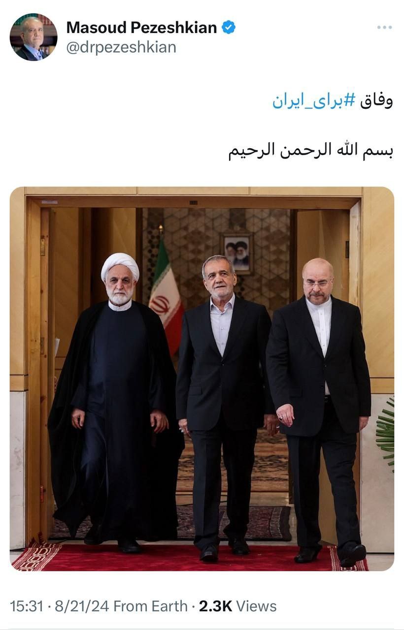 مسعود پزشکیان در توییتر خود برای رای آوردن همه اعضای کابینه نوشت؛ وفاق برای ایران.