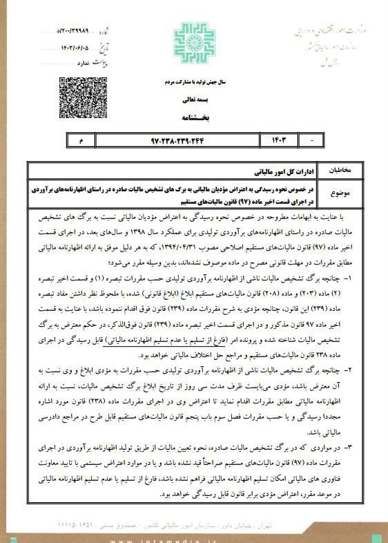 سازمان امور مالیاتی کشور در خصوص نحوه رسیدگی به اعتراض مودیان مالیاتی به برگهای تشخیص مالیات صادره در راستای اظهارنامههای برآوردی در اجرای قسمت اخیر ماده 97 قانون مالیاتهای مستقیم به ادارات کل امور مالیاتی کشور ابلاغ کرده است.
