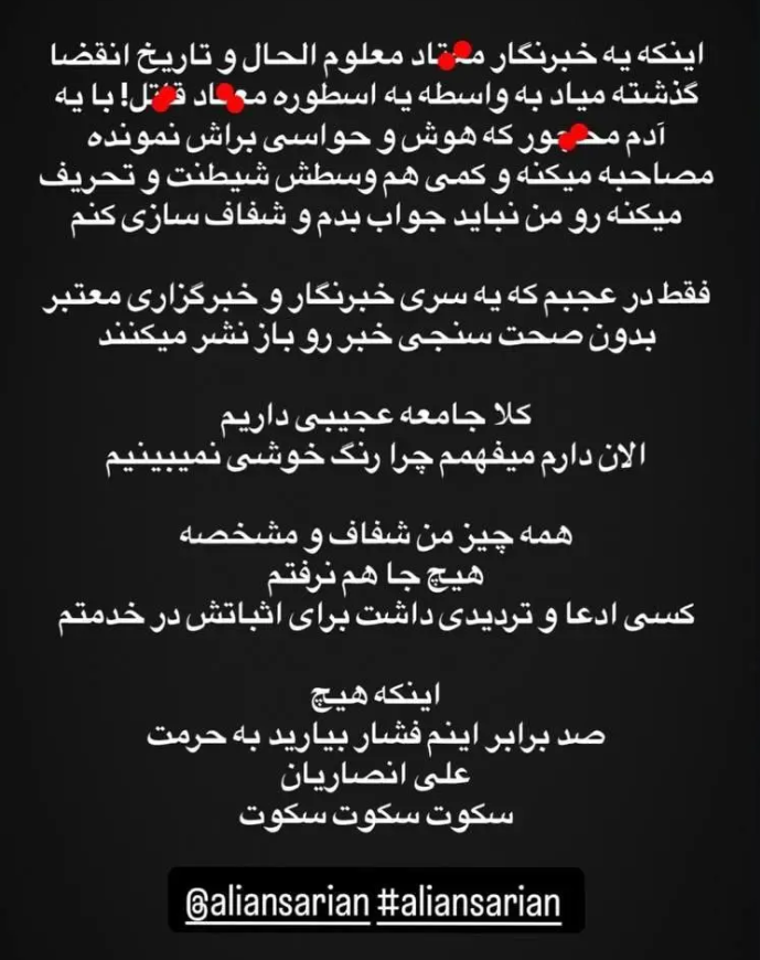 به گزارش سایت طلا، داماد خانواده شادروان علی انصاریان به شایعات به وجود آمده در خصوص تهدید به قتل مادر انصاریان، واکنش نشان داد.