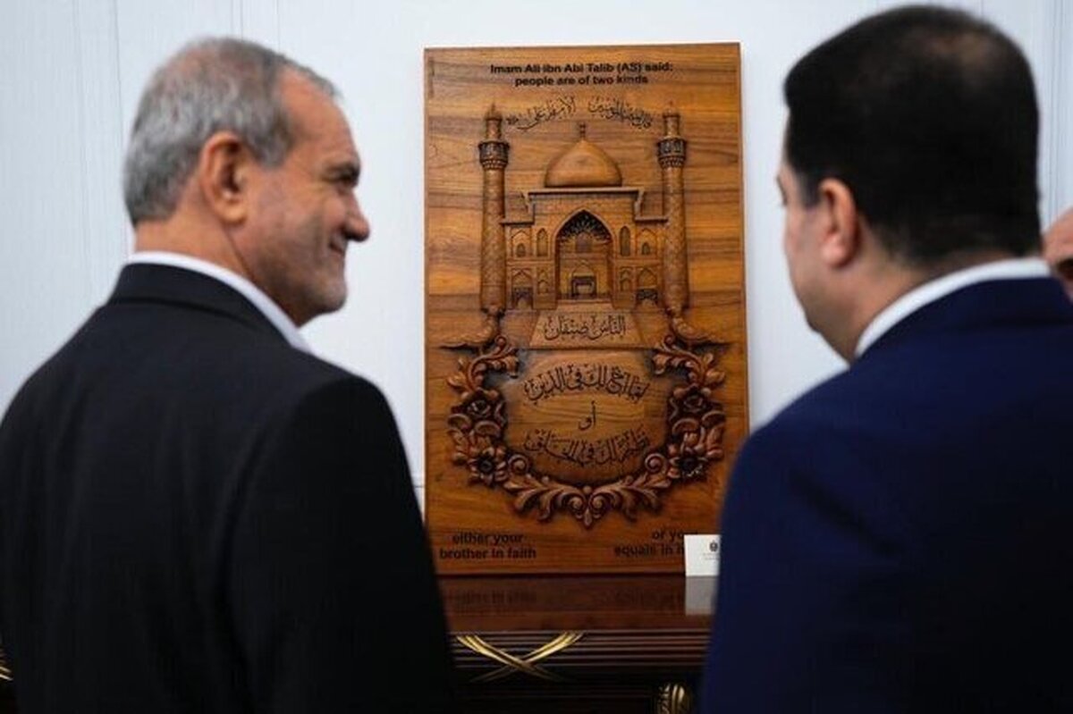 در جریان این دیدار نخست وزیر عراق نیز با اهدای لوح هدیهای منقش به کلامی از امیر المومنین علی (ع) در نهج البلاغه به مسعود پزشکیان رئیس جمهور ایران خوش آمد گفت.