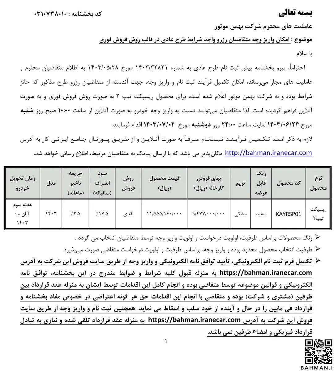 شرایط تکمیل وجه و فروش خودرو ریسپکت بهمن موتور ویژه شهریور 1403 اعلام شد.