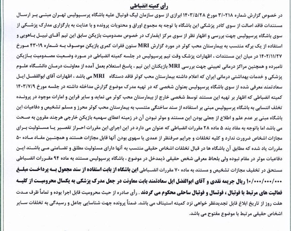 جعل در پرونده پزشکی نیبل باهویی کار دست پرسپولیس داد و این تیم یک میلیارد تومان جریمه شد.