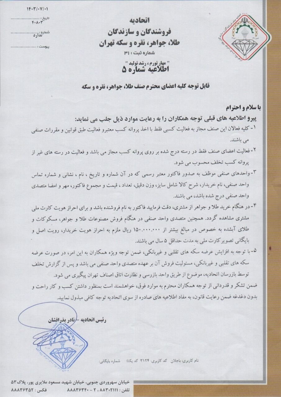 اتحادیه طلا ضمن ابلاغ شرایطی برای فروش طلا اعلام کرد: واحد صنفی هنگام فروش مصنوعات طلا و جواهر مسکوکات و طلای آب شده به خصوص در مبالغ بیش از ۱۵۰.۰۰۰.۰۰۰ ریال ملزم به احراز هویت خریدار، رؤیت اصل و بایگانی تصویر کارت ملی به مدت حداقل ۵ سال است.