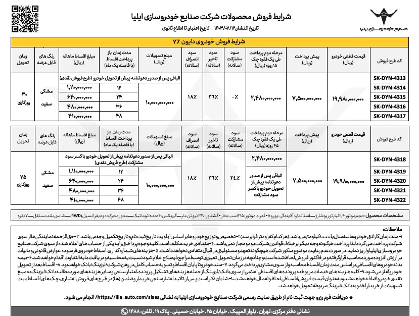 شرکت صنایع خودروسازی ایلیا شرایط فروش دایون Y7 را اعلام کرد.