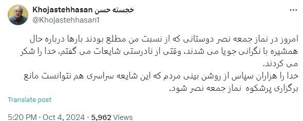 خجسته نوشته است: "امروز در نماز جمعه نصر دوستانی که از نسبت من مطلع بودند، بارها درباره حال همشیره با نگرانی جویا می شدند، وقتی از نادرستی شایعات می گفتم، خدا را شکر میکردند. خدا را هزاران سپاس از روشن بینی مردم که این شایعه سراسری هم نتوانست مانع برگزاری پرشکوه نماز جمعه نصر شود."