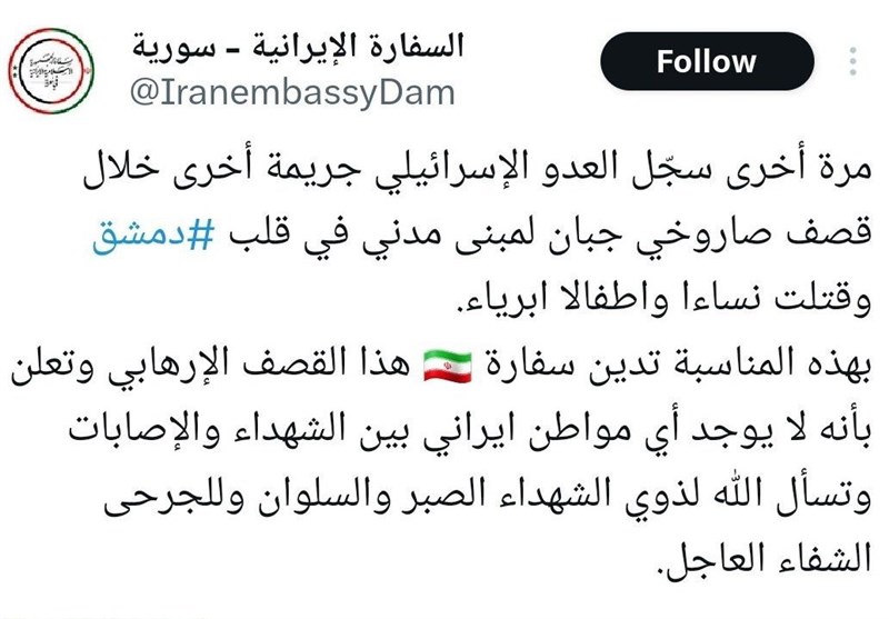 به گزارش سایت طلا،سفارت کشورمان در صفحه ایکس خود نوشت: دشمن اسرائیلی بار دیگر، در جریان بمباران بزدلانه موشکی ساختمانی در دمشق جنایت دیگری را مرتکب شد و زنان و کودکان بی گناه را به شهادت رساند.