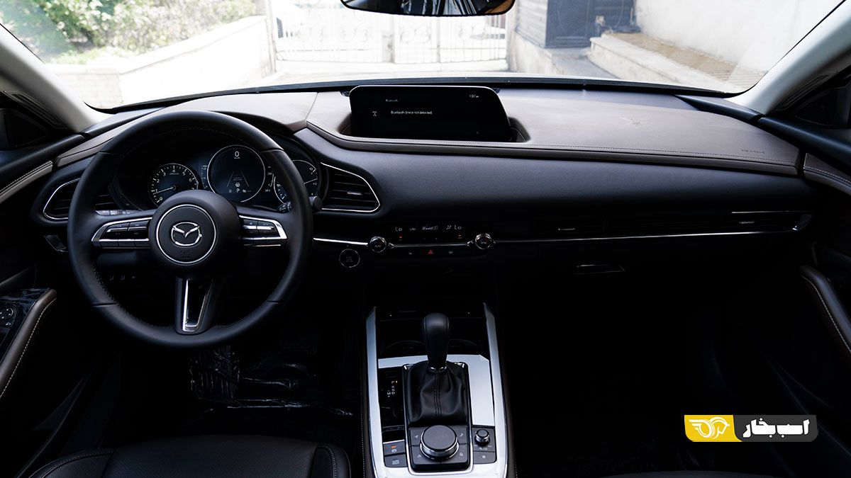 در بخش کابین مزدا CX-۳۰، سبک راننده محور و غیر قرینه را شاهدیم که تریم چرمی دو رنگ مشکی – قهوه ای و قطعات دکوراتیو کرومی، جذابیتی خوبی را همراه باهم برای این خودرو به ارمغان آورده اند. فضای پا و سر در ردیف جلوی این خودرو کافی و مناسب است اما فضای مای ردیف دوم آنچنان تعریفی ندارد و به شما اثبات می کند که کاملا با یک مزدا ۳ قد بلند مواجه هستید.