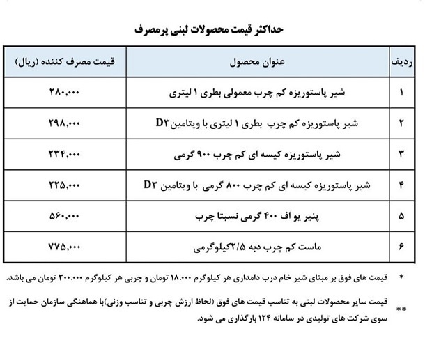 سازمان حمایت مصرفکنندگان و تولیدکنندگان قیمت مصوب شش محصول لبنی شامل شیر کم چرب یک لیتری بطری را 28 هزار تومان، شیر یک لیتری کم چرب بطری با ویتامین د3، 29هزار و 800 تومان، شیر کم چرب 900 گرمی کیسه ای 23 هزار و 400 تومان، شیر کم چرب کیسه ای 800 گرمی با ویتامین د3، 22 هزار و 500 تومان، پنیر یو اف نسبتا چرب 400 گرمی 56 هزار تومان و ماست دبه 2 و نیم کیلوگرمی کم چرب 77 هزار و 500 تومان قیمت گذاری کرده است.