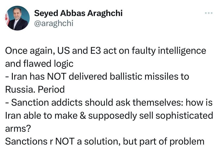 سید عباس عراقچی نیز در واکنش به تحریمهای وضع شده از جانب آمریکا و تروئیکای اروپایی بر ایران در شبکه اجتماعی ایکس نوشت: «یک بار دیگر آمریکا و اروپا بر اساس اطلاعات غلط و منطق معیوب عمل کردند. ایران به روسیه موشکهای بالستیک ارسال نکرده است. تمام.»