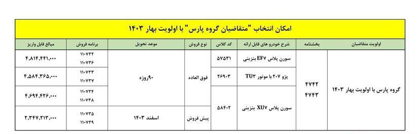 شرایط انتخاب و واریز وجه مجدد برای متقاضیان گروه پارس (XU۷P -ELX) با اولویت بهار ۱۴۰۳ سامانه یکپارچه، مطابق جدول زیر ایجاد شده است.