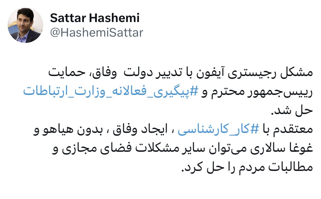 وزیر ارتباطات و فناوری اطلاعات امروز ۹ آبان ۱۴۰۳ با انتشار پستی در یک شبکه اجتماعی اظهار کرد: مشکل رجیستری آیفون با تدییر دولت وفاق، حمایت رئیسجمهور محترم و پیگیری فعالانه وزارت ارتباطات حل شد.