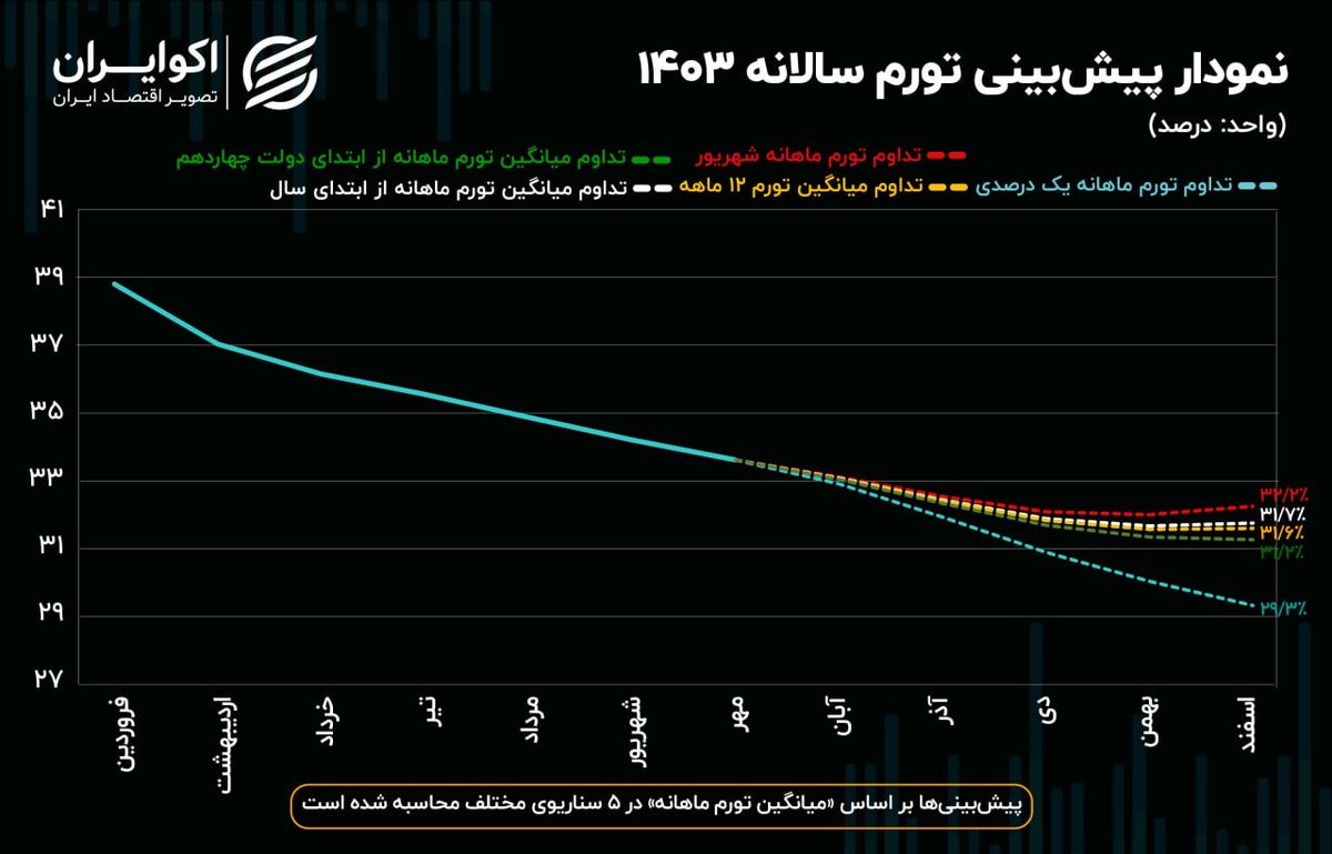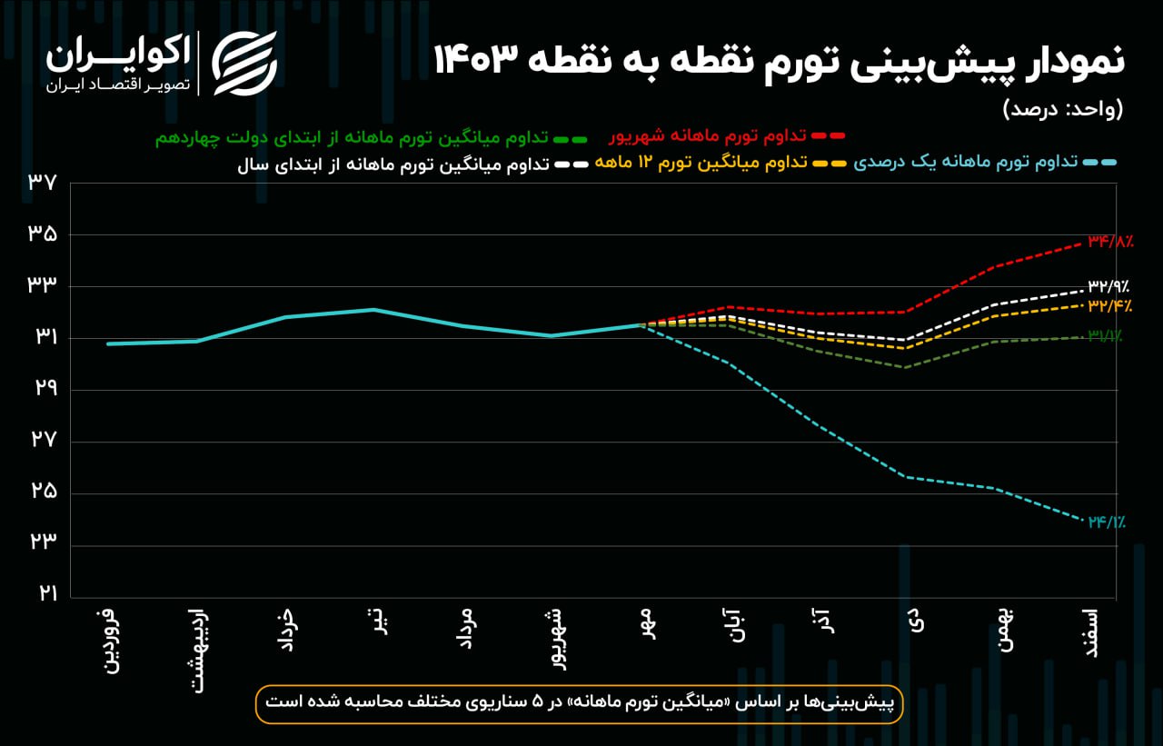 به همین سبب با توجه آخرین آمار منتشر شده از تورم در مهر ماه ۱۴۰۳ میتوان در پنج سناریو تورم را در پایان سال جاری پیشبینی کرد.