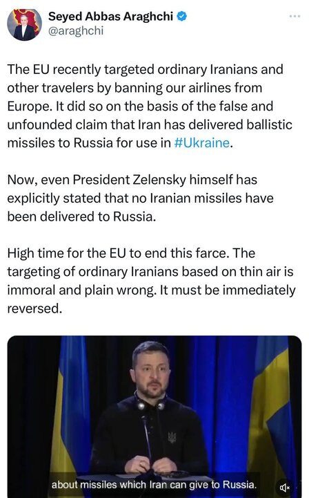 وزیر خارجه ایران در مطلب خود ویدئو «ولودیمیر زلنسکی» رئیس‌جمهور اوکراین را ضمیمه کرده و نوشته است: اکنون حتی خود رئیس‌جمهور زلنسکی نیز به صراحت می‌گوید که هیچ موشک ایرانی به روسیه تحویل داده نشده است.
