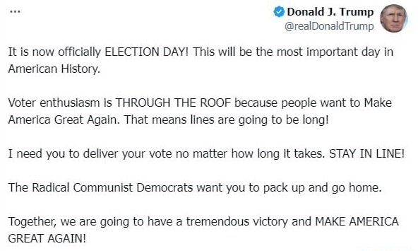 دونالد ترامپ، اضافه کرد: من از شما میخواهم که رأی خود را هر طور که شده به صندوق بیندازید، هرچقدر هم که زمان ببرد. در صف بمانید! دموکراتهای رادیکال کمونیست میخواهند شما از صف خارج شوید و به خانه بروید. با هم، ما پیروزی بزرگی خواهیم داشت و آمریکا را دوباره بزرگ خواهیم کرد!