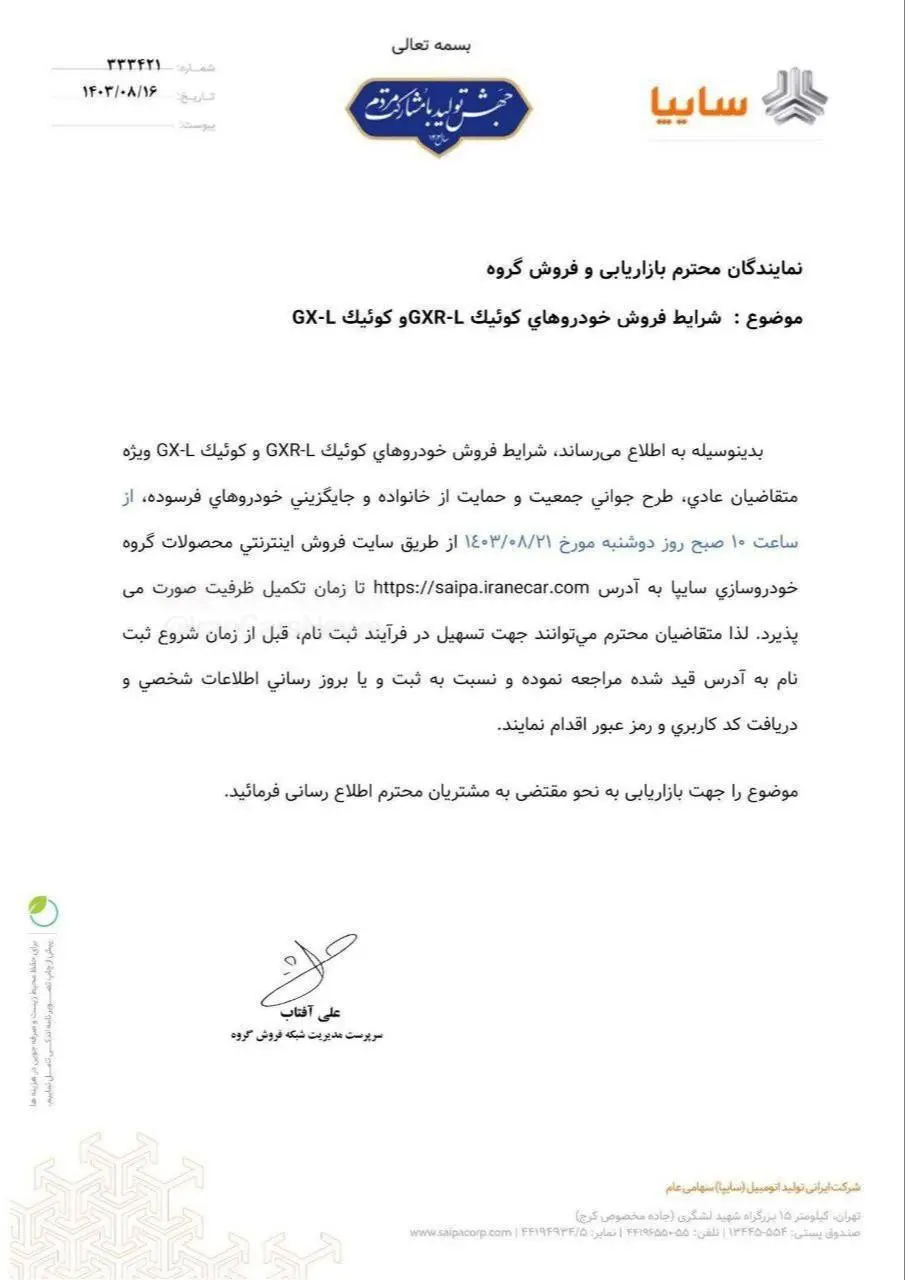 این طرح از ساعت ۱۰ صبح روز دوشنبه ۲۱ آبان ۱۴۰۳، از طریق وبسایت فروش اینترنتی سایپا به نشانی www.saipa.iranecar.com فعال خواهد بود و تا تکمیل ظرفیت ادامه خواهد داشت.