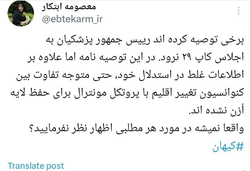 معصومه ابتکار با توجه به موضوع توصیه کیهان به پزشکیان برای عدم حضور در اجلاس کاپ 29 ، از حسین شریعتمداری خواست درباره هر چیزی اظهارنظر نکند.