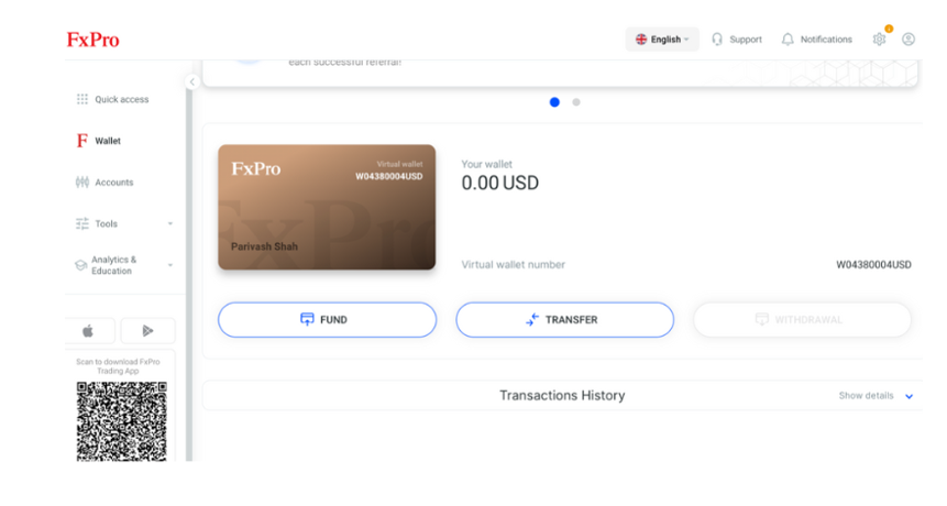 پس از پرداخت ریالی، حساب آواپی شما به‌صورت خودکار در اف ایکس پرو شارژ می‌شود. این اعتبار به نرخ روز تتر و از طریق تبدیل ریال به تتر اعمال خواهد شد. می‌توانید مبلغ شارژ شده به تتر را با کلیک بر روی گزینه “Wallet” در صفحه اصلی حساب خود در اف ایکس پرو مشاهده کنید.