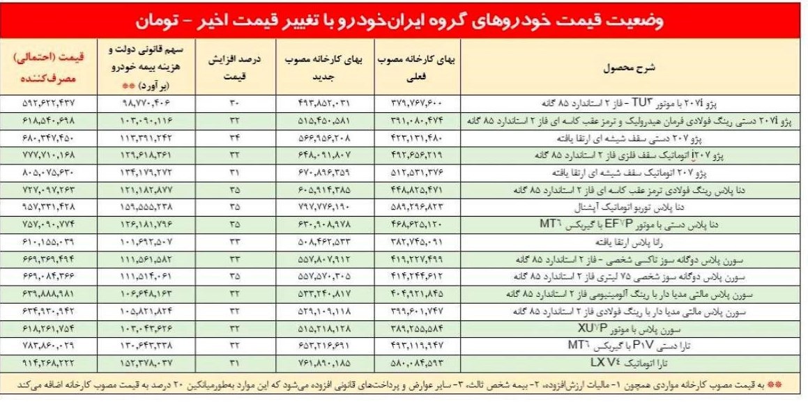 قیمت جدید کارخانه ای محصولات ایران خودرو و سایپا