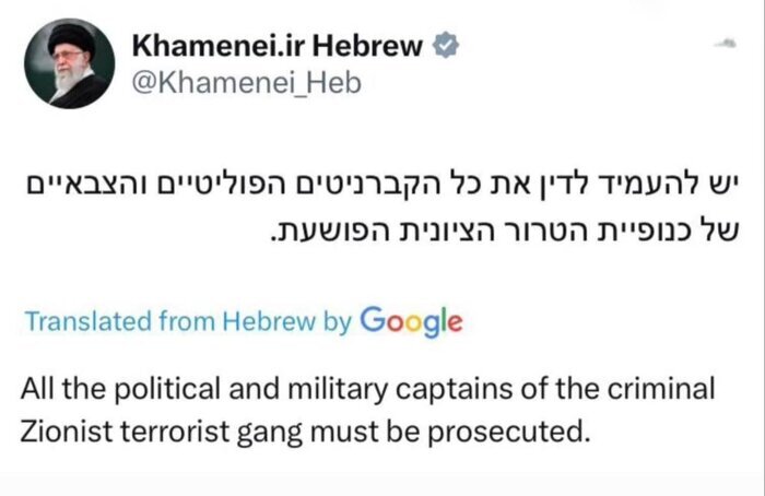 حساب توییتری رهبر معظم انقلاب، در تمتنی به زبان عبری بر محاکمه همه سران باند تروریستی و جنایتکار صهیونیستی تاکید کرد.