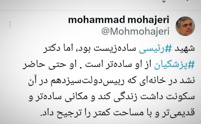 شهید رئیسی ساده زیست بود، اما دکتر پزشکیان از او سادهتر است. او حتی حاضر نشد در خانه ای که رئیس دولت سیزدهم در آن سکونت داشت زندگی کند و مکانی سادهتر و و قدیمی تر با مساحت کمتر را ترجیح داد.