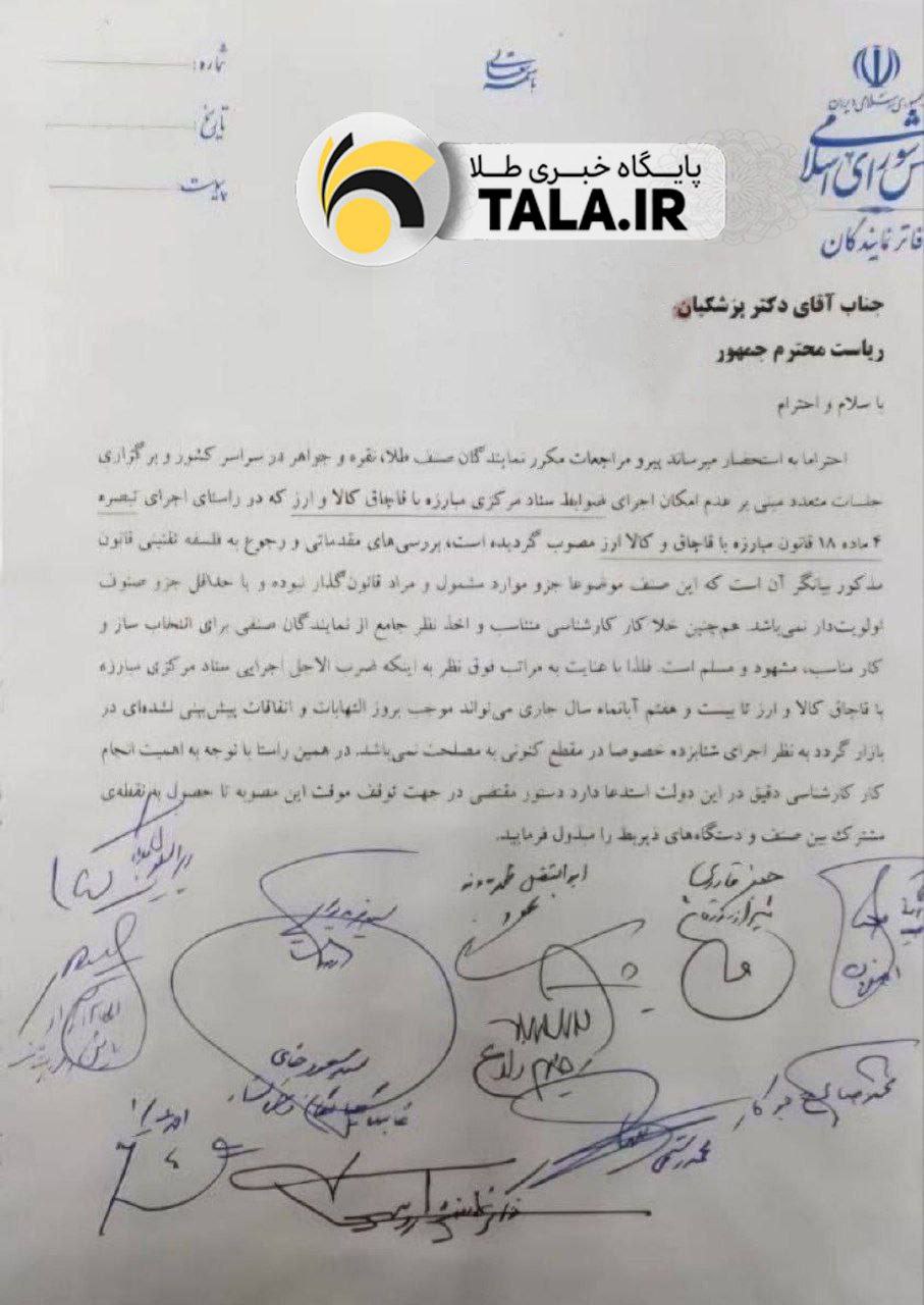 برخی نمایندگان مجلس در نامهای به مسعود پزشکیان، از رئیس جمهور خواستهاند که به دلیل اینکه صنف طلافروشان، جزو اصناف اولویتدار قانون مبارزه با قاچاق کالا و ارز نیستند، اجرای فرآیند ثبت اطلاعات آنها در سامانه جامع تجارت متوقف شود.